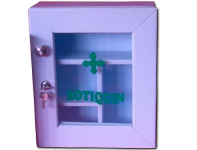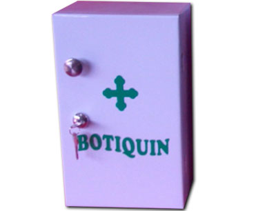 Botiquín elaborado en lámina con pintura líquida electrostática horneable de alta calidad, puerta en vidrio, chapa y llaves; con compartimentos a la vista.