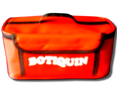 Botiquín en lona impermeable, térmico, forrado con compartimientos internos para mayor organización y visualización de la dotación, con cremallera de lado a lado, manija y correa para transportarlo, color rojo, incluye estampado primeros auxilios.