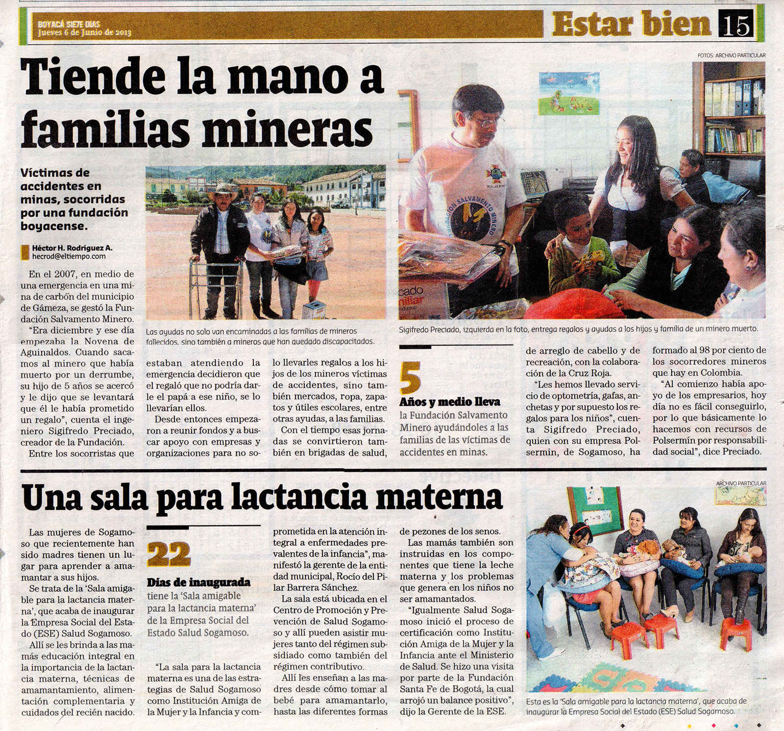 En los últimos años, con recursos de la organización POLSERMIN, hemos logrado llevar una voz de aliento a las familias (padres, viudas y huérfanos) de los mineros fallecidos, así como los discapacitados en desarrollo de la actividad minera, con la intención de mitigar el dolor y la ausencia causadas por la desaparición de quienes fueron el soporte económico de estas familias que quedan desprotegidas, entregando en diferentes municipios mineros: Mercados, kits escolares, ropa, calzado y juguetes.