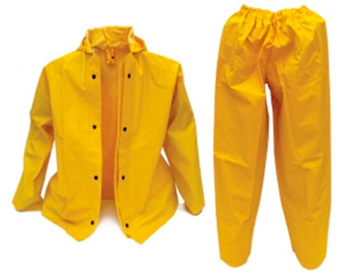 Juego de impermeable con capucha, chaqueta de 32 pulgadas de largo, dos bolsas laterales con solapa y broche de seguridad. Broches ajustables en la muñecas y tobillos, costuras selladas con ultrasonido y broches de plástico ocultos con solapa o cartera. Ventilación en la zona de espalda y axilar. Capucha integrada. Tallas: M, L, XL, 2 XL. Color: Amarillo.