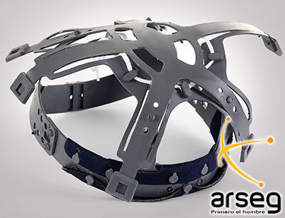 Tiene diseño de seis puntos de apoyo y sistema de amortiguación mediante cordón anticontusión o por medio de cinta de nylon tejido, que disminuye la fuerza transmitida en caso de impacto. Disponible también con 4 puntos de absorción de impacto por medio de cintas de nylon tejido.